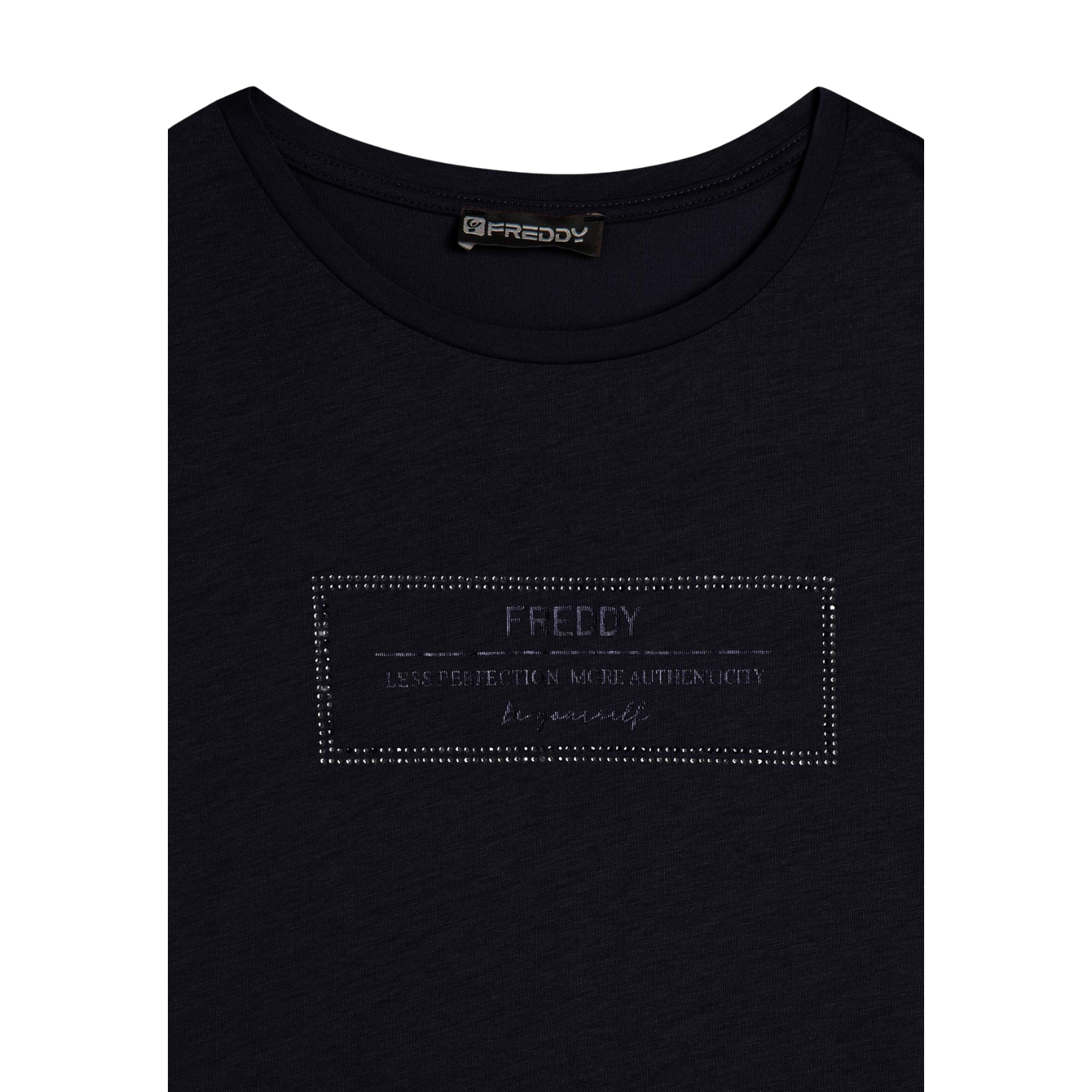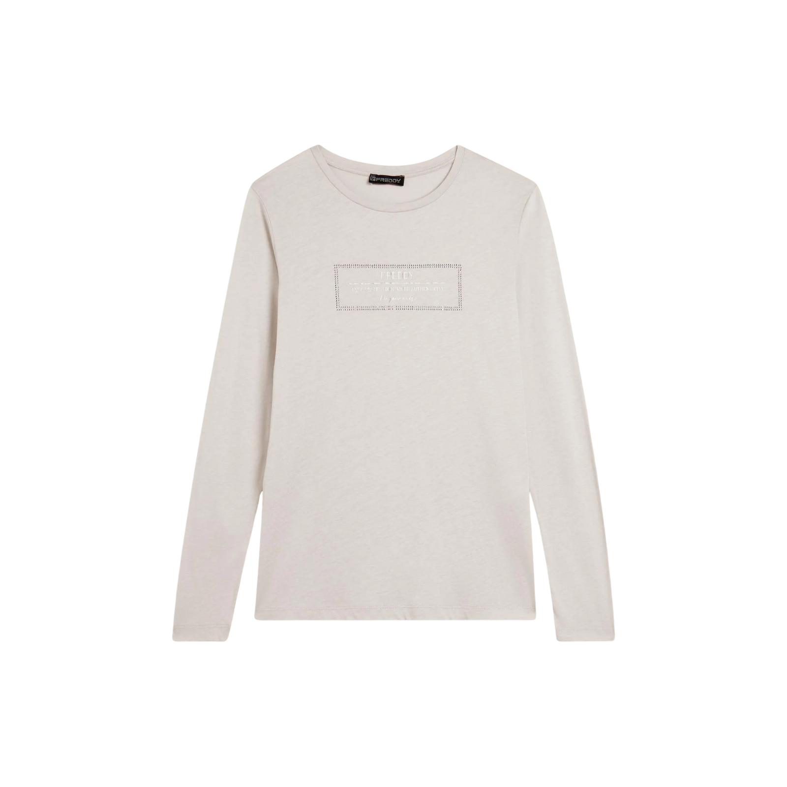 Realizzata in jersey modal di cotone, questa t-shirt lunga da donna assicura una sensazione di morbidezza e freschezza per tutto il giorno. Il fondo dritto presenta profondi spacchi laterali che donano movimento e un tocco di femminilità al capo.La grafica metallizzata, arricchita da dettagli in strass, esalta il logo FREDDY e i particolari laterali, conferendo un elegante effetto luminoso e sofisticato.Composizione: 50% Cotone, 50% Modal.