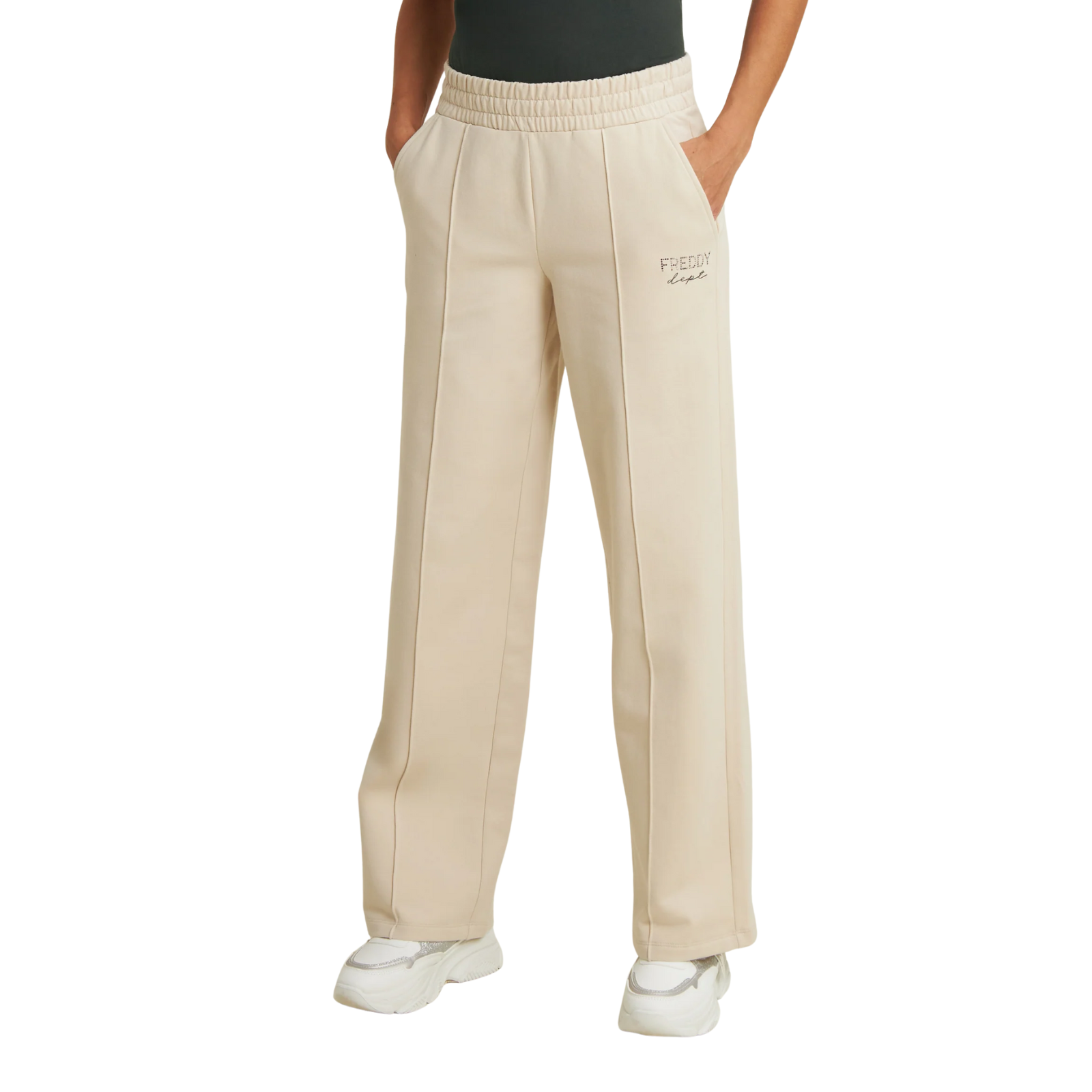 La vita regular è dotata di elastico interno e coulisse regolabile dall’interno per una vestibilità personalizzata. Le pratiche tasche alla francese e il logo FREDDY in borchie sul fianco sinistro completano il design con dettagli curati e femminili.